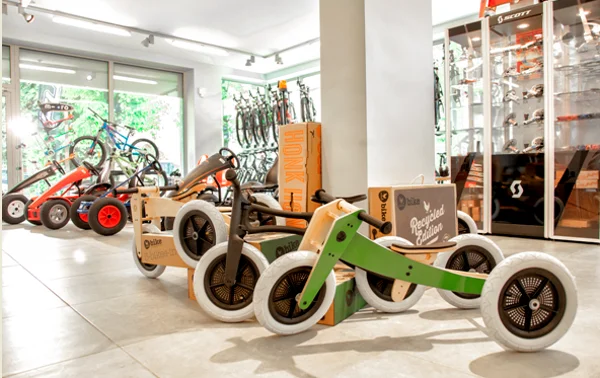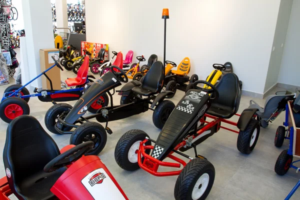 Друго нещо, което прави впечатление в магазина е, че веднага събужда детски желания за дивотии. Вътре е пълно с всякакви тротитентки – от такива за прохождащи деца до варианти за непораснали възрастни, дори за „про”-та, които правят трикове на рампа. Тротинетките са подредени по големина и съответно – възраст. Дждажа на 4 гуми, която се намира в различни размери за различни възрасти са кратовете с педали. Изгледат като ATV-та, задвижвани с човешка сила. Освен че малките са много подходящи за децата, големите могат да доведат до много забавления по паркове и поляни.