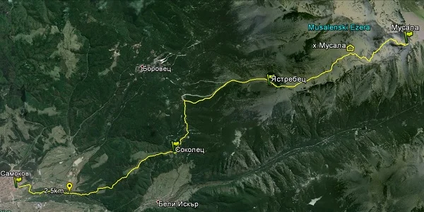 Стартът на състезанието е на входа на парка, до стадион “Рилски спортист” (970 м надморска височина, координати 42°19’29.76″С 23°33’34.20″И). Трасето преминава по екопътеката до Искъра, на 3 км започва изкачване по горски път до лагера Соколец – 8 км, следват 2 км по пътя Бели Искър-Боровец, 4 км по ски пистата до Ястребец, 4 км до хижа Мусала и 3км до върха (2925м н. в.).