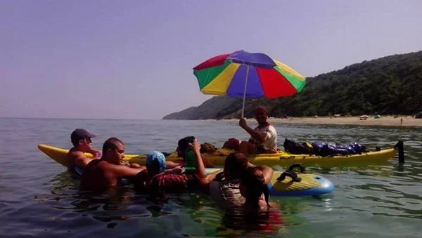 Хубавото на каяка е, че има лодки за туризъм и лодки за бърза вода (налични сред познатите ни там), които могат да се използват за сърфиране, което прави двата дни доста приятни. Срещаме и много приятели и „бедстваме” безкрайно приветливо край бурното море. На втория морето изглежда почти добре и следобед тръгваме към Созопол. Да, ама не. Едва подали се от залива почваме да гребем нагоре. Вълните са по 2 метра и се налага да гребваме по 2-3 пъти, за да ги изкатерим. Перспективата да прекараме в такива условия няколко часа ни е крайно неприветлива и се прибираме в драматични условия на остров Св. Иван, да доизчакаме прогнозата да се оправи. Нощуваме в пустошта сред зайци, гларуси и змии. Утрото е чудесно, морето е спаднало и гребането до Маслен нос е ведро и със смело подцепване през заливите. Минаването на Маслен нос е едно от по-сериозните предизвикателства, за които сме мислили преди тръгването. Около него морето никога не е съвсем спокойно и захождаме с уважение и леко пренапрегнати от това какво може да ни посрещне на самия нос. Толкова е красив, че забравяме всички притеснения. Гребем общо рекордните 37 км, от които 15 в открито море, казваме за последен път „здравей” на делфините и стигаме до острова срещу Арапя. Правим си кралска вечеря, защото виждаме края, дори се отпускаме. На следващия ден сме много изкушени да стигнем до Резово, но подхождаме разумно и паркираме превозните средства при приятелите ни на ветроходната база на „Вятър и Вода” в Синеморец. Прогнозата за времето отново почва да се разваля, а ние се отдаваме на малките радости от живота – къпане в баня, вкусна храна, бар „Кораба”.