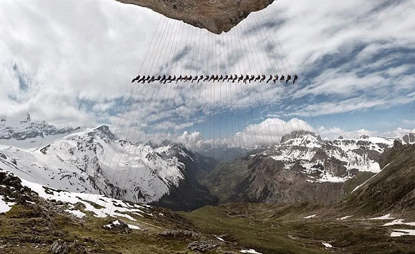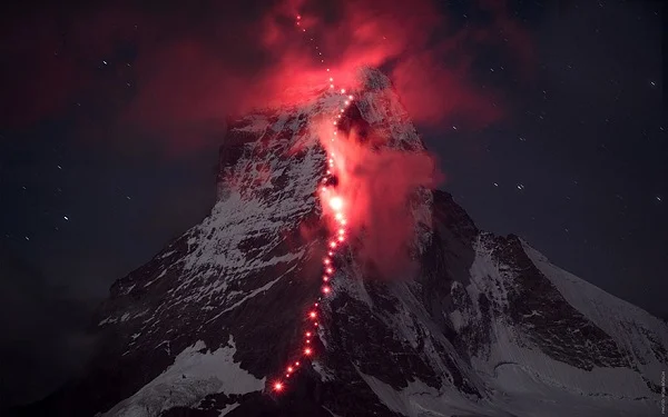 Инициативата за тази мащабна снимка идва от швейцарската компания за планинска екипировка Mammut, които наемат фотографа Робърт Бьош да отбележи годишнината с кадър. А как се постига такъв ефект? Трябват ви доста планинари, които да изкатерят билото на върха един след друг, като всеки носи ярка червена светлина със себе си. Те представляват стъпките, които Едуард Уимпър е направил по пътя нагоре.
