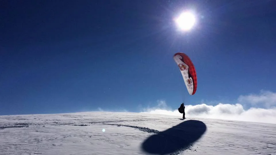 С тези снимки можем да се порадваме на акробатичния ни парапланерист Веселин Овчаров, който тества нов спорт – парапланер със сноуборд.