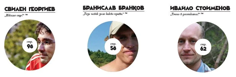 - Свилен Георгиев – В този брой неговите теми не са малко – от срещата на изкуството с фрийстайл спортовете, през патагонската експедиция, статията за катерача-фотограф Руслан Вакрилов до етиката на ендуро мотоциклетизма. Ако след всичко това и вие искате още – има го, при това по много и редовно, даже направо ежедневно. Свилен е един от основните автори в нашия сайт 360mag.bg.