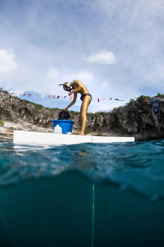 През декември Мок-Бънтинг пътува до Бахамите за състезанието Vertical Blue (Вертикално синьо). Събитието събира най-добрите в света при главозамайващата Синя дупка на Дийн, гмуркаща се на дълбочина от 202 метра. Състезанието е в дисциплината „постоянен баласт“, в която гмуркачите се спускат и изплуват със собствени сили, като използват тежест. Някои ползват плавници, но мнозина смятат свободното гмуркане без тях за най-чистата форма на гмуркане.