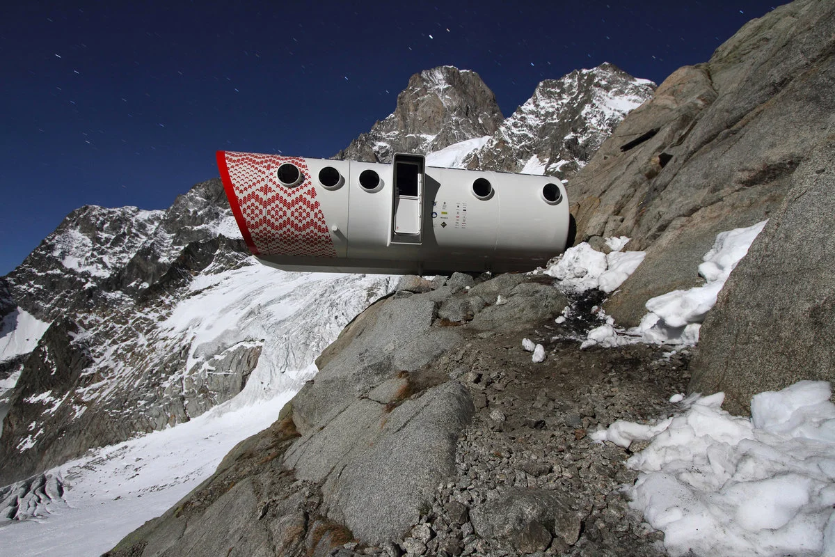 Наподобяващата тубичка на паста за зъби форма на заслона е вдъхновена от морски и космически дизайни. „Джервасути“ се намира на 2835 м височина, под огромните стени на Гран Жорас. Хижата има 12 легла и е построена да издържи изпитанията на времето, но не всички одобряват футуристичния ѝ дизайн.