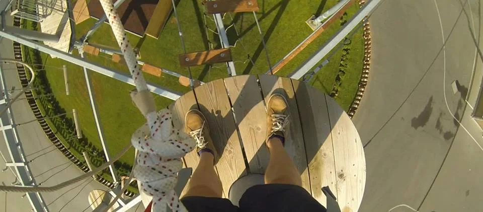 25 минути и три приплъзвания по-късно мога да потвърдя, без изобщо да се замислям – да гледаш напред и нагоре наистина помага. Следващата стъпка е 14 метра над земята.