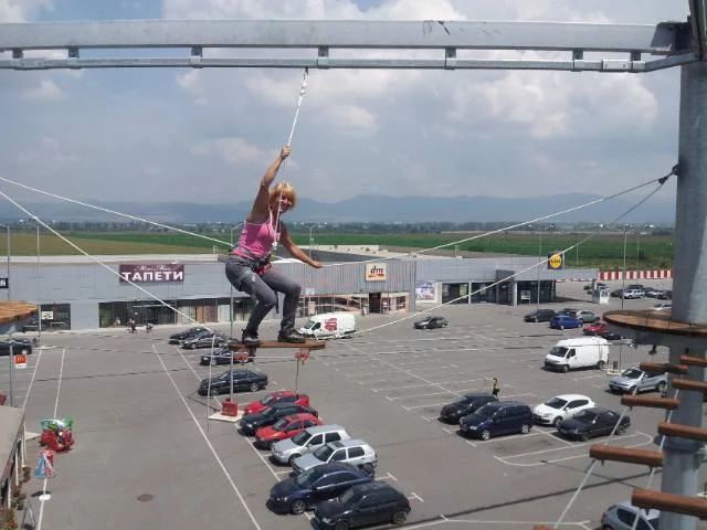 Този път обаче избираме да се издигнем над нещата в ритейл парка Jumbo Plaza Sofia. На паркинга там се извисява въженият парк SkyHiker и всеки желаещ може да се разходи във въздуха под открито небе напълно безопасно, и да погледне света от 7 и/или на 14 метра височина.