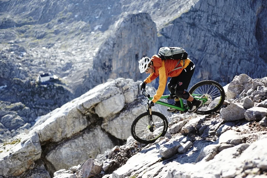 Видеото от първо спускане с планински велосипед по катерачен маршрут, което прави Харалд Филип, можете да видите тук