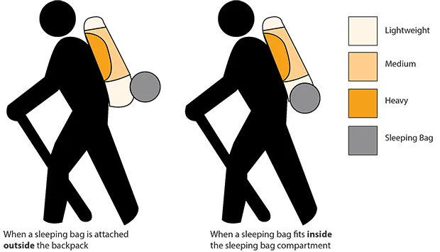 Леките неща като спален чувал и екипировка, която ще ви е необходима само за преспиването, се слагат най-отдолу в раницата. Единствените „нощни” принадлежности, които не бива да са на дъното, са челникът и/или фенерчето ви. Източниците на светлина трябва да бъдат поставяни на леснодостъпни места.