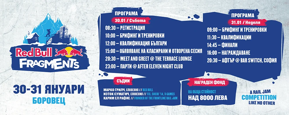 Публиката пък, ще може да участва в игра за спечелването на 5 двудневни лифт карти за Боровец. Това, което трябва да направите е да качите снимка, свързана със събитието, на стената на FRAGMENTS във фейсбук или да споделите в инстаграм с таг #redbullfragments2016 и #myborovets. Това обаче не е всичко – в събота вечер ще бъде организирана вълнуваща Meet&Greet сесия, на която всички фенове ще могат да се запознаят с участниците в състезанието, а Burton, XRescue и Animal обещават много приятни изненади за публиката.