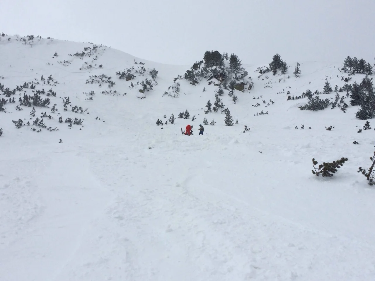 Яааа, щеката на А.Г. е на 2 метра от мен. Това тази щека ли е или другата. Бързо сканирам за другите. Викам всички ли са добре. Засичам А.Г. и се втурвам за щеката му. „Братле, намерих я!“ Мисията изпълнена. Шегата настрана – това беше съвсем случайно. Следващите 1-2 часа търся ските. Ами явно докато ме е носела лавината, просто са потънали след безкрайните буци. В шок съм. Не лошо, просто невъзбуден. Неосъзнаването какво се е случило някак ме успокоява и все едно нищо не е станало. Бях отметнал по-рано, че момчетата ме водят. Да, веднага след случката бях супер, със самочувствие и увереност. Нека се върна на онзи невероятен слон – реброто на един от Бъндеришките улеи. Е вече нямам раница или по-скоро патрони в нея. Наоколо всичко се свлича, търкаля и цепи. Краката ми треперят и искам да се върна. Няма и грам спомен от самочувствието. Момчетата усещат моята тревога, страх и несигурност. Трябва да се осъзная. Това би попречило на всички.