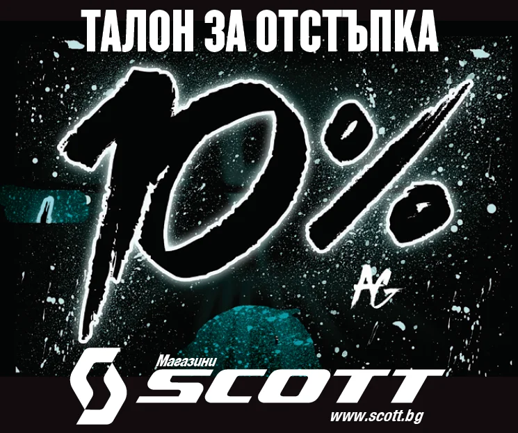 Този талон важи за читатели на списание 360° до 15.06.2016 г. и може да се използва в официалните магазини на Scott в София – България, бул. България 81Б и ул. Козяк 14. Той не може да се комбинира с други отстъпки и промоции.