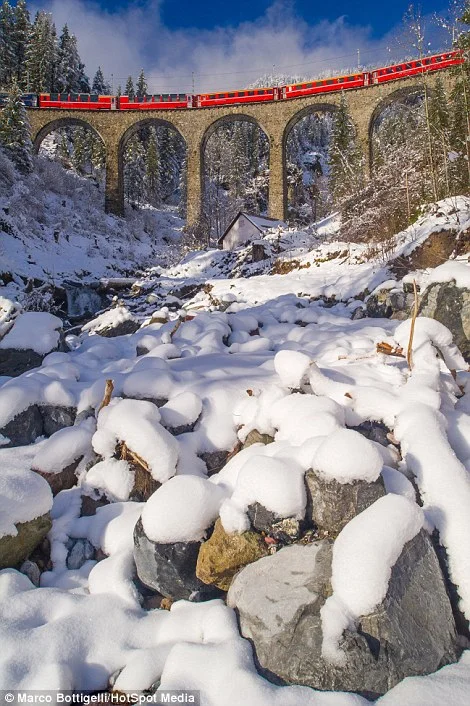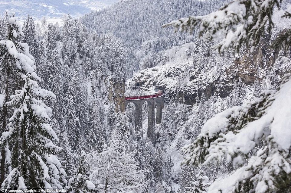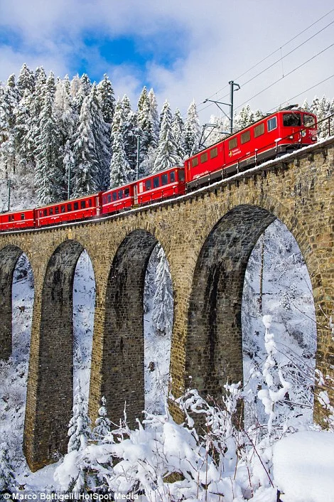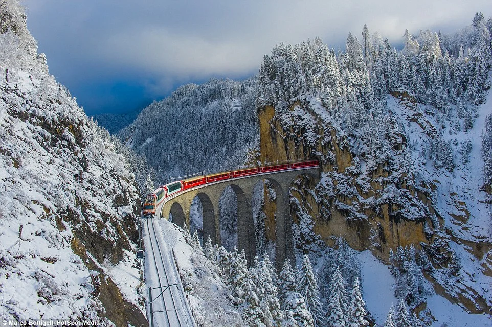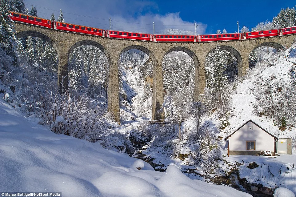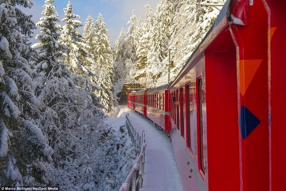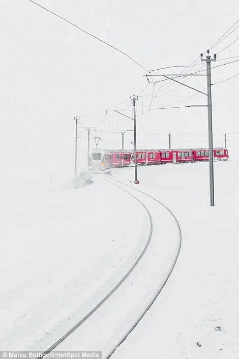 Ако дългите часове катерене, които откриват зашеметяващи гледки, не са вариант за вас, може… да хванете влака. „Бернина Експрес“, който свързва Швейцария и Италия, е известен с това, че е най-високата железопътна линия в Алпите. Композицията, която се промъква през заснежените планини, не е за изпускане. Доказват го и снимките на италианските фотографи Марко Ботижели и Франческо Ванинети.