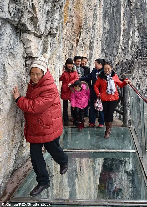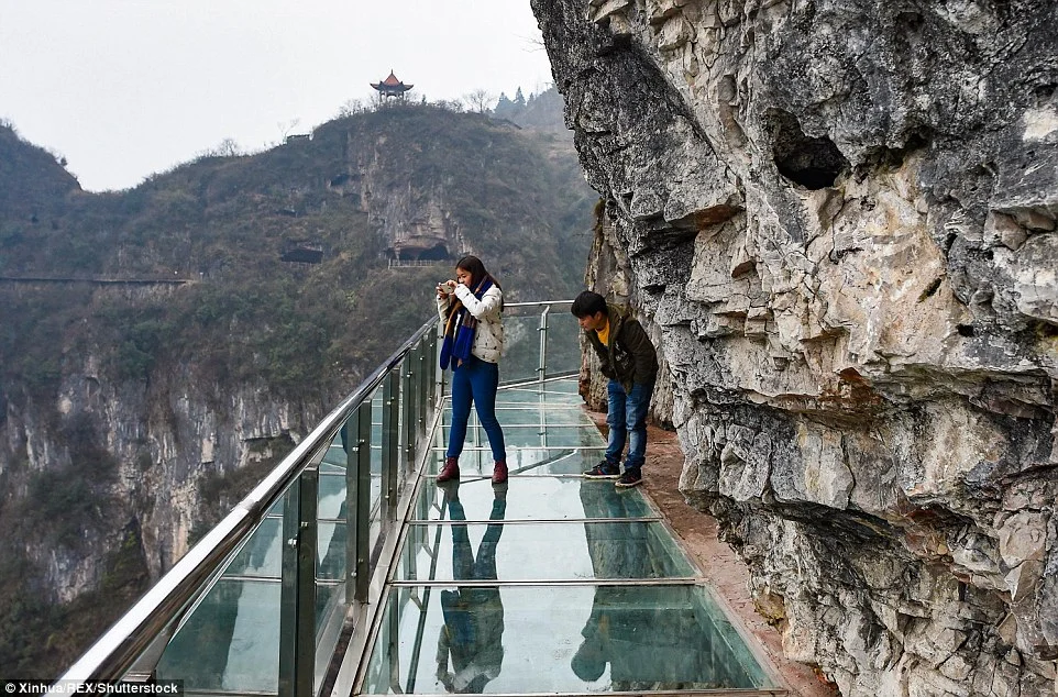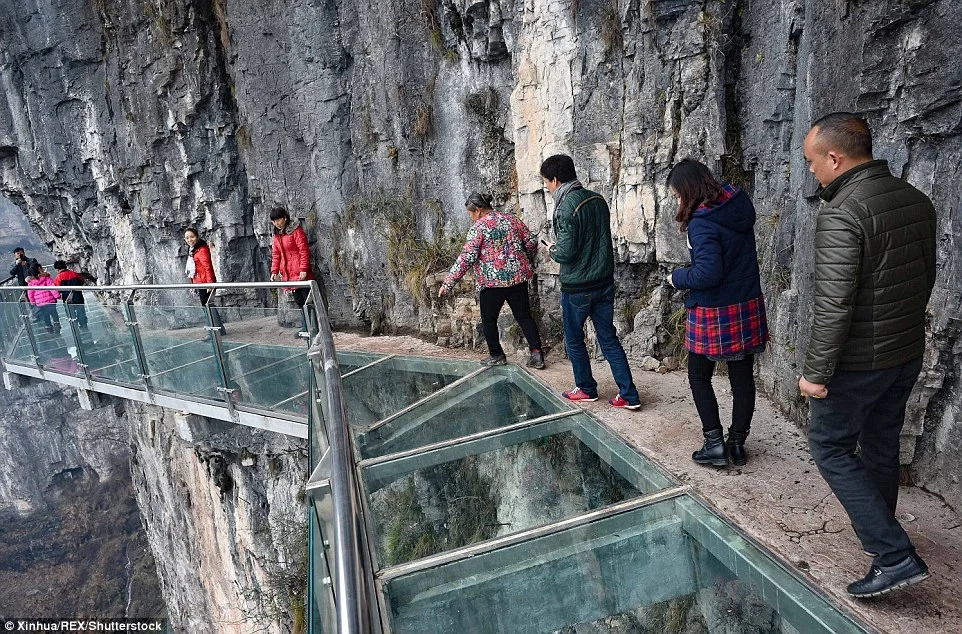Не гледайте надолу, ако имате страх от високо! Стъклена пътека в скалите в Китай, разположена на 100 метра над долина, предлага екстремна разходка. Дължината й е над 1000 метра, но още при първите стъпки много от посетителите прилепват към скалите и рядко поглеждат към пропастта под тях. Това е първата подобна структура в национален парк в провинция Гуейджоу.