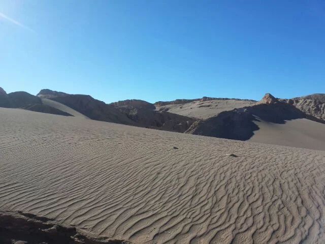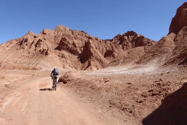 Безпорно обаче най-голямата атракция на Севера е селцето Сан Педро де Атакама и преди всичко неговите околия. Пристигнахме тук преди няколко дни късно вечерта. Не планирахме да стигнем до тук в същия ден, но накрая с помощта на силния попътен вятър навъртахме 106 км и минахме през прохода от 3500 метра преди Сан Педро след което се спуснахме със залязващото слънце към града. Последните няколко дни тук прекарахме, правейки еднодневни екскурзии с колелета из околието – из „Долината на смъртта“, „Лунната долина“, „Дяволският каньон“ и лагуните на солника на Сан Педро. Природата тук е невероятна и не може да се сравни с нищо от това, което съм виждала до сега.