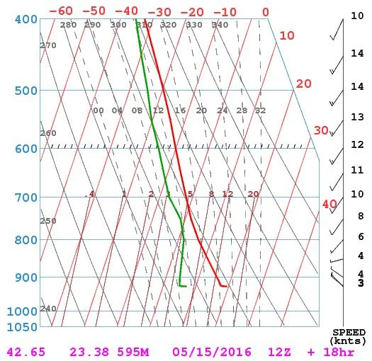 Вятърът щеше да е слаб от запад – югозапад с база на облаците около 2000 м. Сондажът показваше една много влажна във височина атмосфера, а силно сближените линии на температурния профил и точката на оросяване вещаеха образуване на дебели облаци, които щяха да стоят дълго, без да се разпадат и да правят обширни сенки. Градиентът на температурата иначе беше добър, така че дори и със сенки се очакваше да има термики в тази силно нестабилна атмосфера.