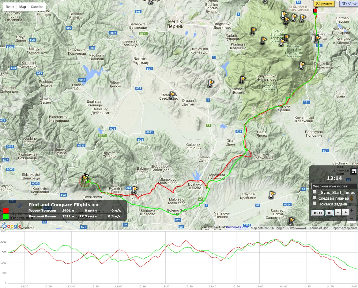 Групичката ни се разцепи – някои караха по-близо до активните облаци, други поизостанаха. Аз се движех на изток по слънчевите части, изцяло извън облаците и завивах по-близо към тях само когато се снижавах под 1400 м.