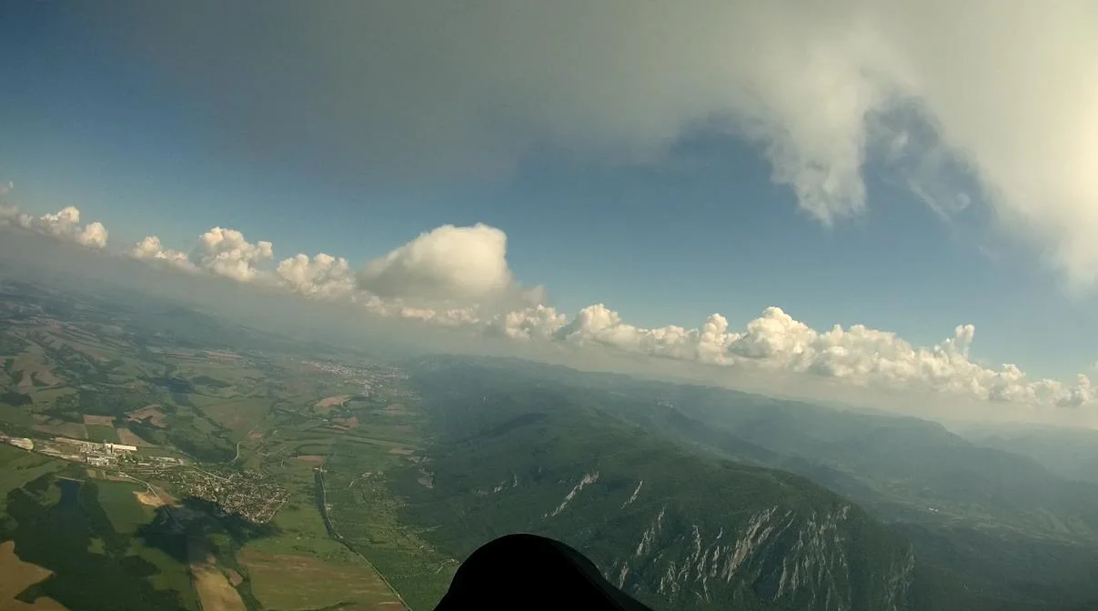 Изкачихме се лесно до базата на облаците, която беше на около 1700 м. Условията наистина изглеждаха изобилни и тъй като полето беше нашарено от сенките на кумулусите, без особени притеснения напуснах „сигурното” летене над склоновете на Врачанския балкан и се насочих право напред от старта в посока Веслец. От предните си полети на това място знаех, че по-ранното отделяне от планината в посока Веслец става като цяло по-лесно и по-често успешно, отколкото ако се направи чак след пресичането на Вратцата.