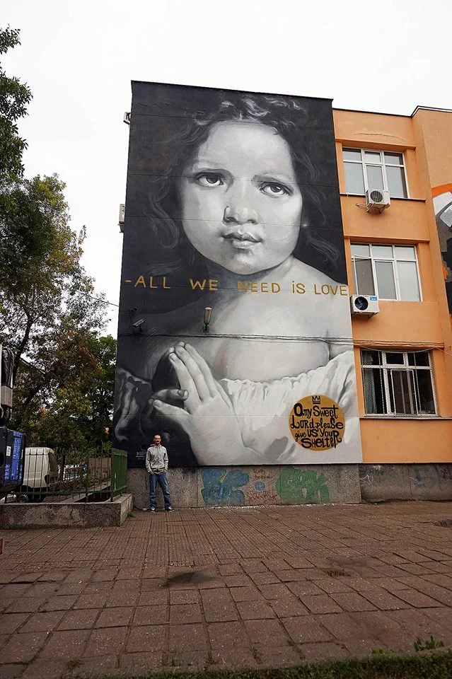 Във всеки свой проект се раздава като за последно. Особено това си личи в огромната и изключително въздействаща картина с лика на дядо Добри на калкана на блок в софийския квартал „Хаджи Димитър“. 100-годишният аскет, който всеки ден пътува от селото си до София и дарява всички събрани пари на храмовете, страшно много впечатлява родения през 1979-а графитър. „Виждаш в него това, което искаш да постигнеш. Той абсолютно се е отдал на Бога. Исках чрез него да покажа добродетелите, към които трябва да се стремим.“