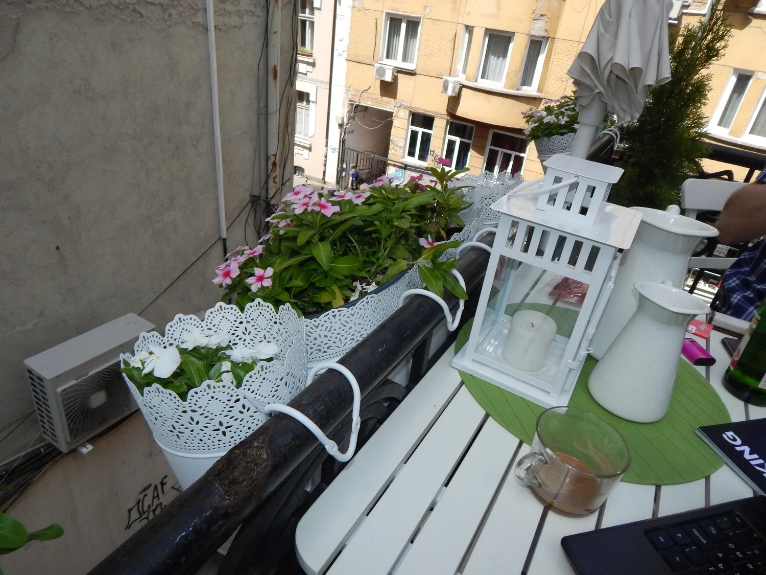 Точно, когато си си помислил, че не можеш повече да функционираш правилно в горещината и задуха на софийското лято (поредното, в което всички други събират миди, тен, гледки, покорени планински върхове, спомени от нощи под звездите, които са по-близо от всякога точно този юли, а ти работиш) – разбираш, че има един малък, сгушен между старите хладни сгради, балкон, точно в центъра на столицата, който те очаква, за да си починеш за един час, да изпиеш едно кафе сред свежа обстановка и да погледаш забързания ден на всички останали като на забавен каданс и отвисоко.