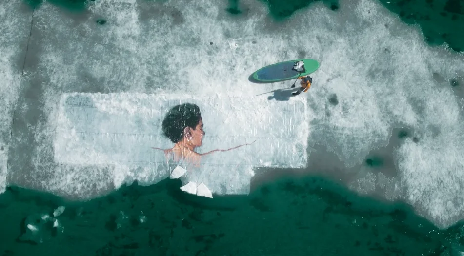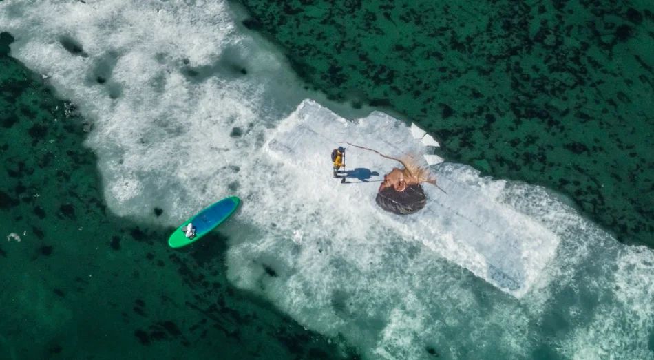 SUP е основна част от екипировката му. 14 часа търси перфектното платно за последната си творба, като е напълно наясно, че и айсбергът, и рисунката върху него, няма да съществуват дълго.