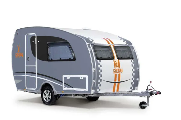 С елегантния си дизайн и аеродинамична форма Campy може да ви създаде добро настроение навсякъде. С него ще изпитате истинско удоволствие от къмпингуването. Той е компактен, лек и маневрен. Моделите на Campy са в три цвята: стандартно бяло, сребърно и полярносиньо и съответните пакети с оборудване. Допълнителните алтернативни апликации от фолио – „Rallye“ и „Sunglasses“ се предлагат само в комбинация с полярносиньо.