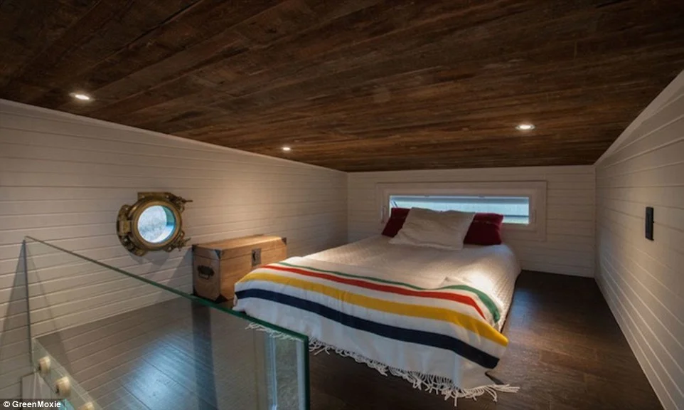 Стълбище в кухнята води до горния етаж, където е спалнята. Пространството е достатъчно за двойно легло с обзавеждане от двете му страни.
