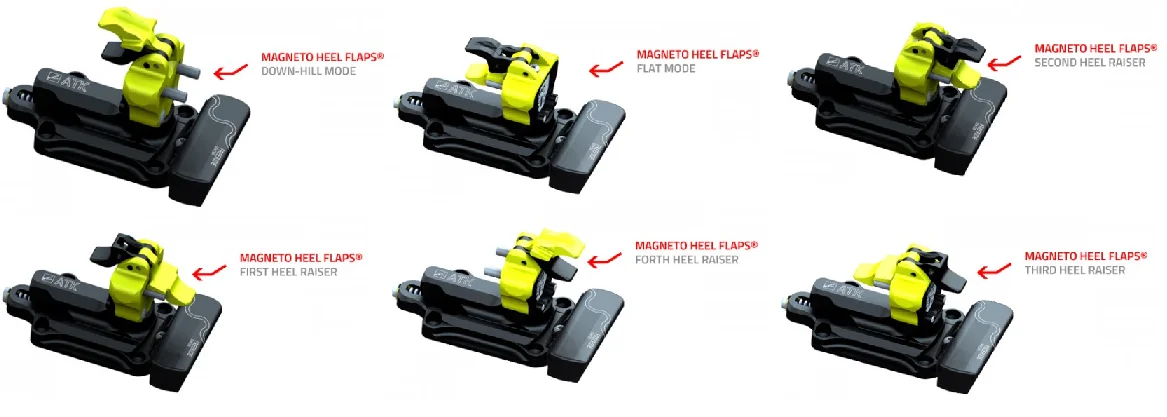 MAGNETO® HEEL FLAPS е технологията, която ни позволява да заемаме пет различни позиции върху ските. Тя подобрява комфорта при носене на ските и позволява по-бърза смяна на позициите с помощта на два магнитни елемента, които се активират от предната част на автомата.
