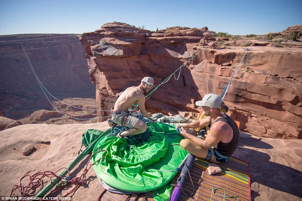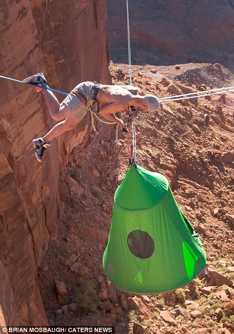 Авантюрист издигна къмпинга до ново ниво, като увисна в малка палатка над каньон на 122 метра височина.