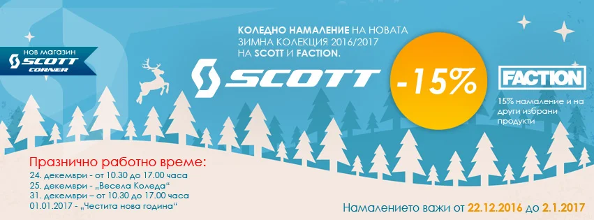 Дали по случай успехите си, или защото са готини и искат да ни зарадват в дните преди празниците, от Scott Bulgaria в момента са обявили коледно намаление – новите зимни колекции на марките Scott и Faction са намалени с 15% от 22-ри декември до 2-ри януари.