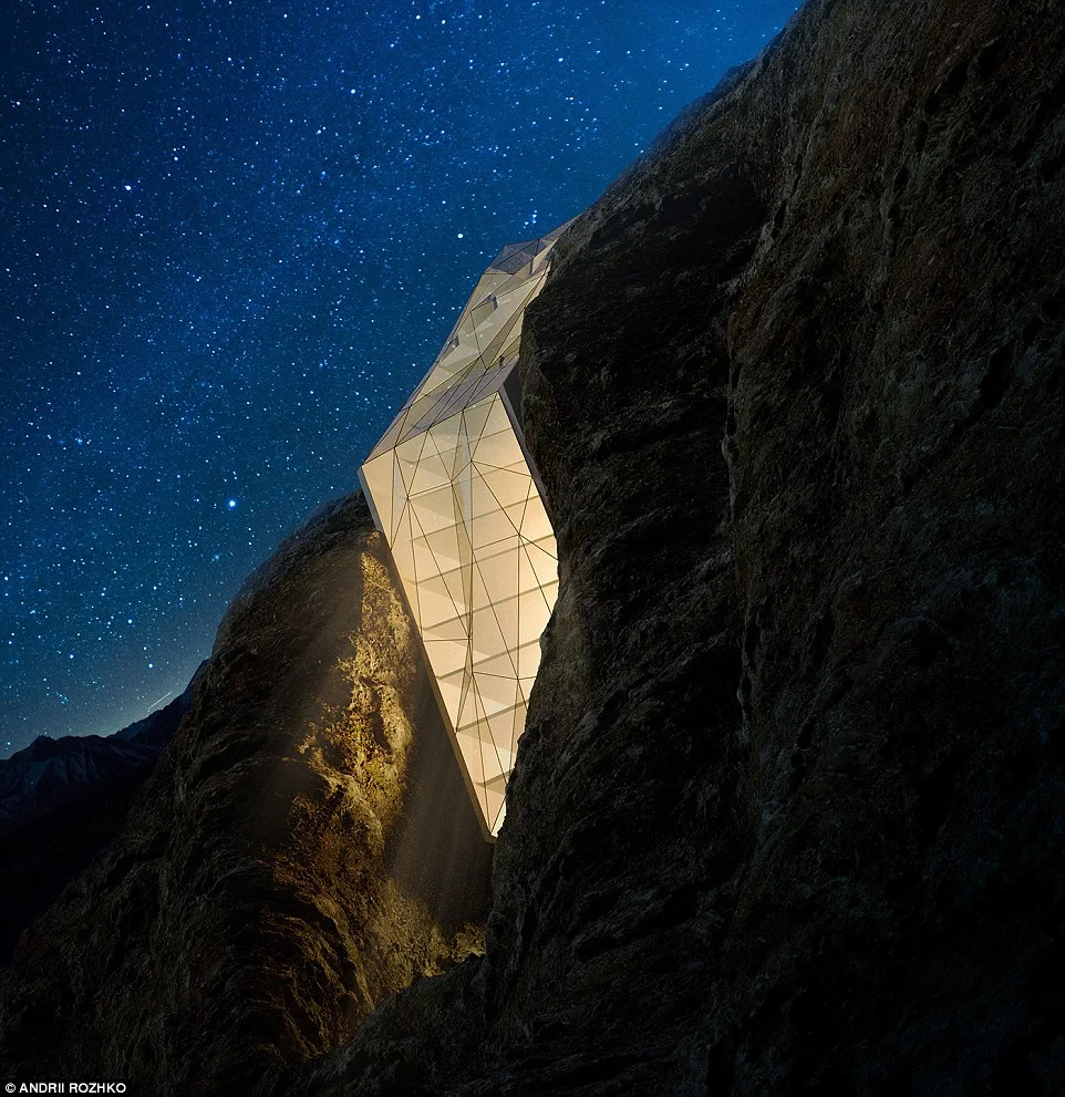 Необичайният подслон ще кацне в Алпите, ще има неправилна форма, следваща скалите и ще прилича на назъбен кристал. А на върха на скалата ще има площадка за хеликоптер.