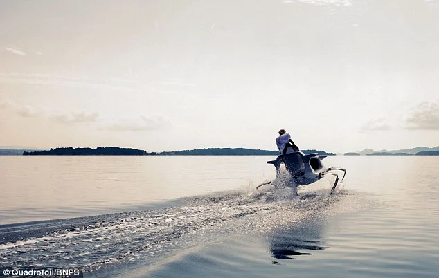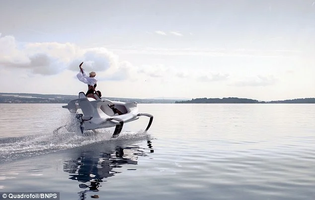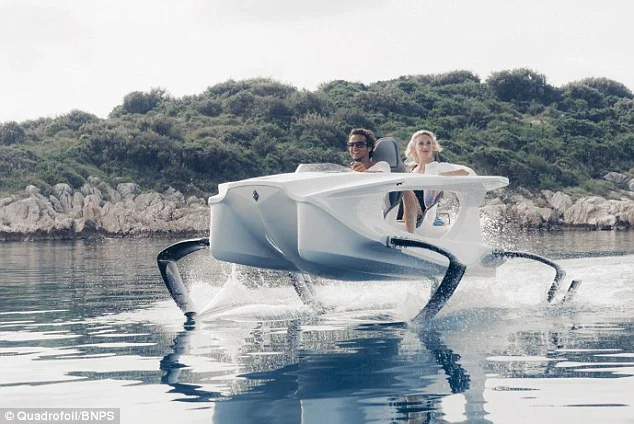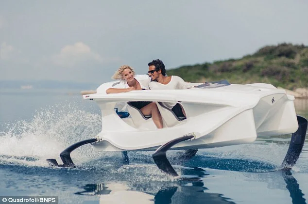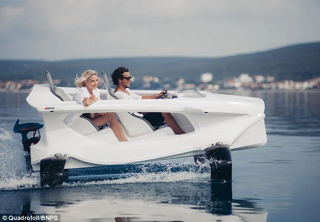 Електрически катамаран в стил Джеймс Бонд безшумно „лети“ над водата. Има четири подводни криле, които го повдигат над вълните, захранва се от електромотор и развива до 40 км в час.