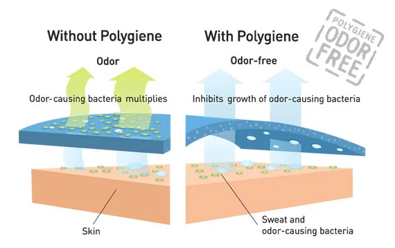 Polygiene се грижи за свежия вид на дрехите ни, като превантивно спира растежа на бактерията, предизвикваща лошите миризми. За да направи това, технологията използва слабо концентриран сребърен хлорид, а създателите ѝ гарантират, че тя не спира своето действие с продължителното използване на дрехите и прането им. Най-хубавото е, че Polygiene не взаимодейства с кожата ни, а с тъканта на дрехите, които носим, защото всъщност потта сама по себе си няма мирис, а го създава от досега си с материите. Материите, обработени с Polygiene, се нуждаят от по-редки изпирания, което ги прави изключително подходящи за няколкодневни преходи, когато теглото на раницата ни е от определящо значение.
