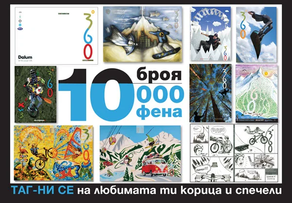 360° се върти на 360 градуса и обратно от кеф – и причината за цялото ни щастие е не друго, а ВИЕ! Хората, които ни харесват и подкрепят – и това само във facebook, удариха 10000! Как да останем безучастни?! За да върнем жеста, решихме да спретнем една томбола и да дадем шанс на най-големите късметлии сред вас да спечелят страхотни награди, осигурени от нашите приятели от Dakine. За целта: имате визия, обединяваща десетте ни досегашни корици. Всеки от вас, който се тагне на изображението, участва в томболата! Спечилите ще изтеглим на случаен принцип, а вие не му мислете – тагвайте. Стискаме палци на всички!