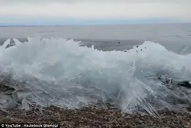 Успех в сърфирането върху това! Ефектно видео улавя разбиването на „ледени вълни“ в замръзналото езеро Байкал в Русия.