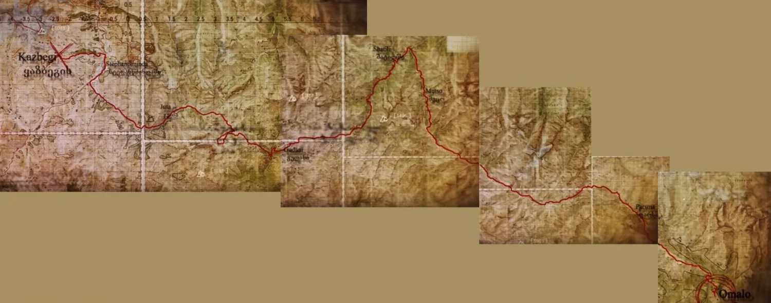 Начална точка за групата е село Омало, до където може да се стигне с организиран транспорт през високопланинския проход, носещ името Абано. Маршрутът продължава през прохода Накле-Коли, с пресичане на река Парикита-Алазани, към селата Парсма и Гиреви и накрая през прохода Атсунта, към село Шатили. Преходът до тук отнема около четири пълни дни. От Шатили се продължава в Гадили и след това Рошка.