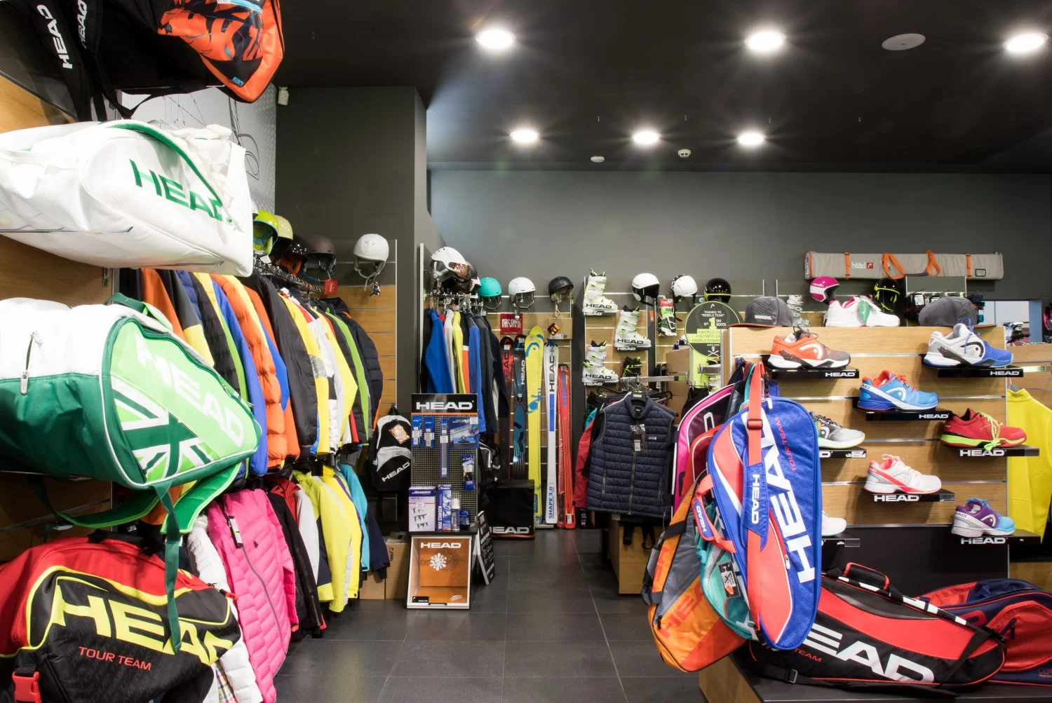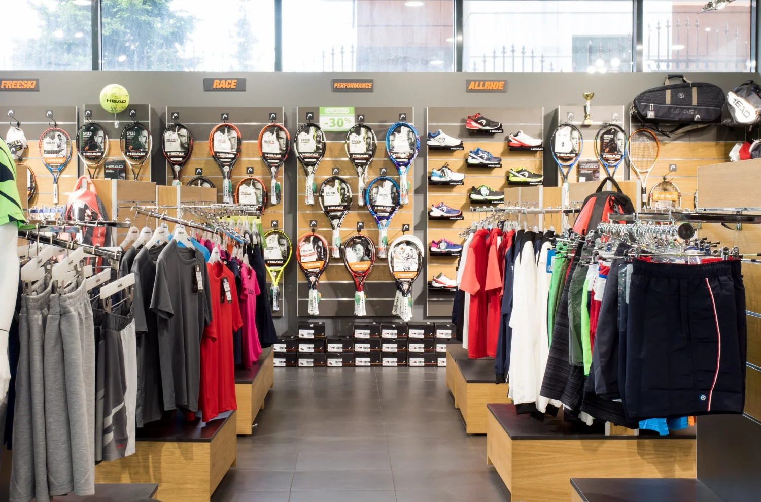Една част от площта е посветена на екипировка за тенис, плуване и зимни спортове.