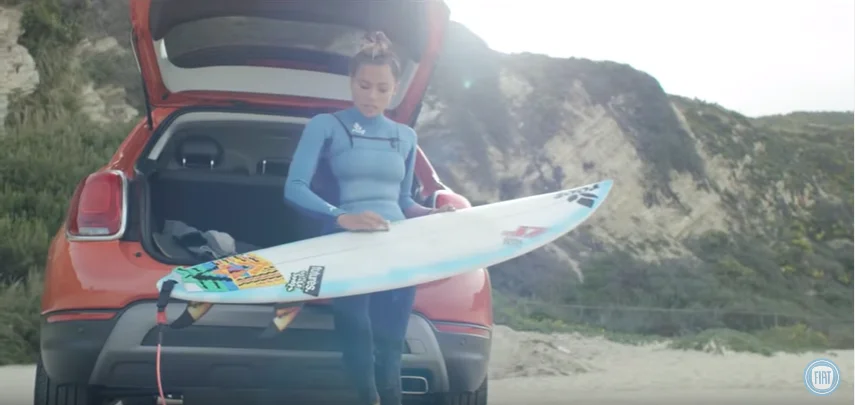Видеото на Тиа – Triple Threat, ни отвежда до три различни дестинации в Калифорния – Малибу, Санта Моника и езерото Big Bear. До всяка от тях младата сърфистка се придвижва със създадения именно за подобни приключения Fiat 500x.