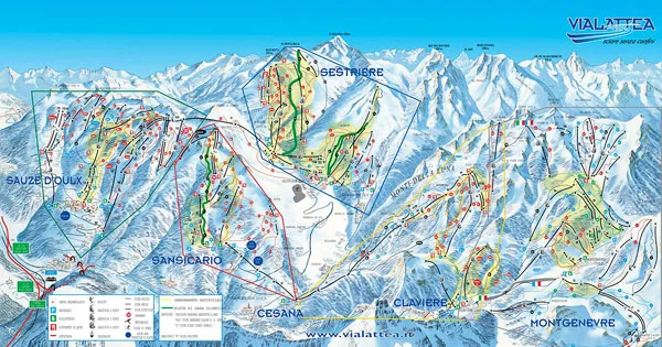 На картата на Алпите е обозначено местоположението на курортите. Съответно със синьо – Сестриере, а с червено – Ливиньо