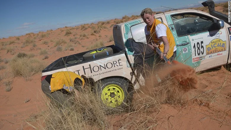 „Една от колите спря на половината път надолу по дюната, което никога не би трябвало да се прави“, казва тя. „Ние се ударихме в колата и нашата предната броня се разби“. Това обаче не ги спира да поемат към финала.