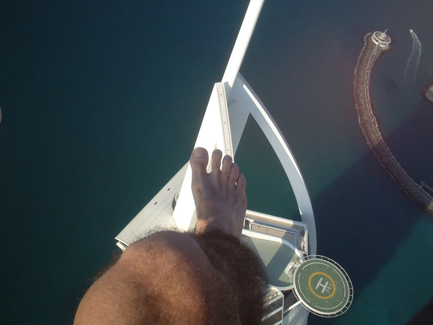 „Бях ходил вече 5-6 пъти в Дубай, където станах близък с Махфус Шухайбер – палестински беглец, който ме викаше да обучавам хора – приятелите му. Правехме партита за Коледа, по време на които Дядо Коледа кацаше на сцената с парамотор. През 2003-та година той ме покани да направя летателно училище в Дубай и така останах там няколко години. Но има един конкретен случай: излетяхме от Джумейра бийч (аз и Ицо-Гумата) с два парамотора, като аз бях с такъв, който си бях направил сам и имаше 68-сантиметрова перчица. Както си летяхме, просто реших, че мога да кацна на Бурдж ал-Араб. Кацнах, отново излетях оттам и след това окончателно се върнах долу на плажа. Там обаче ни чакаше полиция – шейхът се обадил и казал, че има терористи или шпионин, който снима със светкавица (беше надвечер, аз в действителност снимах и светкавицата светнала). Той ме видял и се притеснил, а полицията трябваше да ме арестува – това им е работата. Прекарахме с Ицо една нощ на дивана във фоайето на полицията, а на сутринта ни донесоха кафе и кроасани и казаха: „Нали обещавате, че няма да правите повече така?“