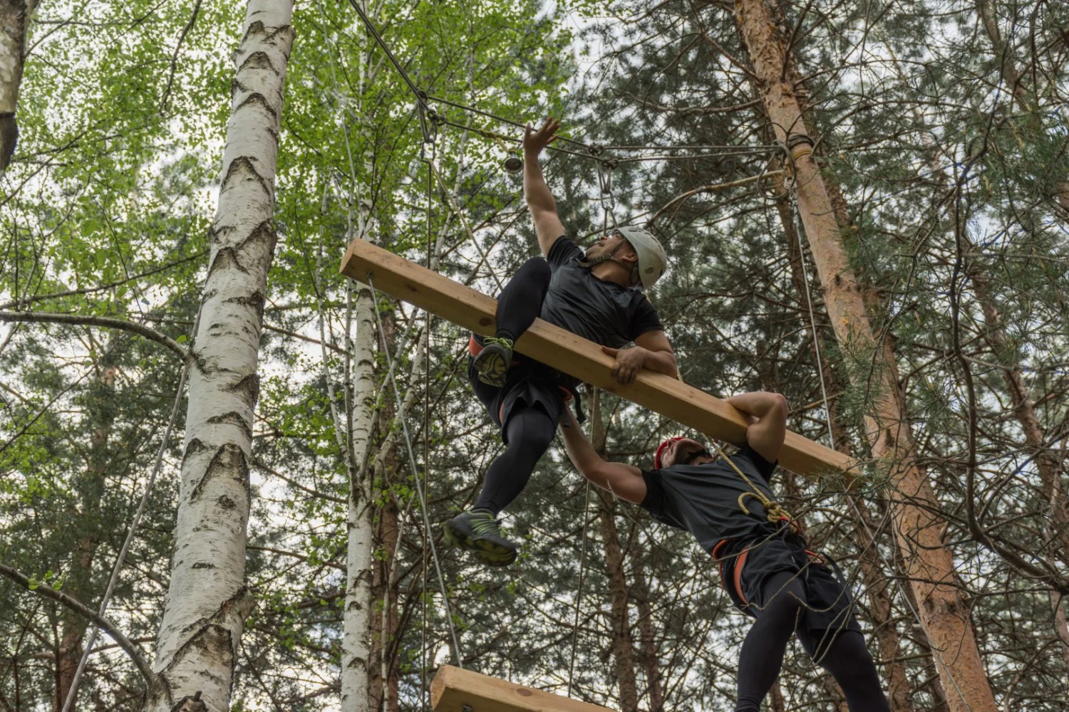 Голямо предизвикателство за нас се оказа ходенето по лента, опъната V-образно между три дървета. Беше нужно да се подпираме един друг по определен начин, за да успеем да я извървим и в двете посоки. Там си беше истинска драма – изгубихме много време, уморихме се доволно, изнервих се стабилно, но след доста опити и магическото махане на чорапите (никога с чорапи, пичове!) – успяхме.