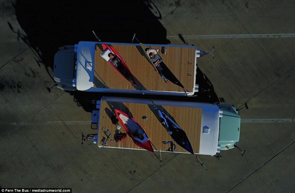 Едноетажният автобус сега е снабден с външен душ, два хамака на покрива и напълно оборудвана кухня.
