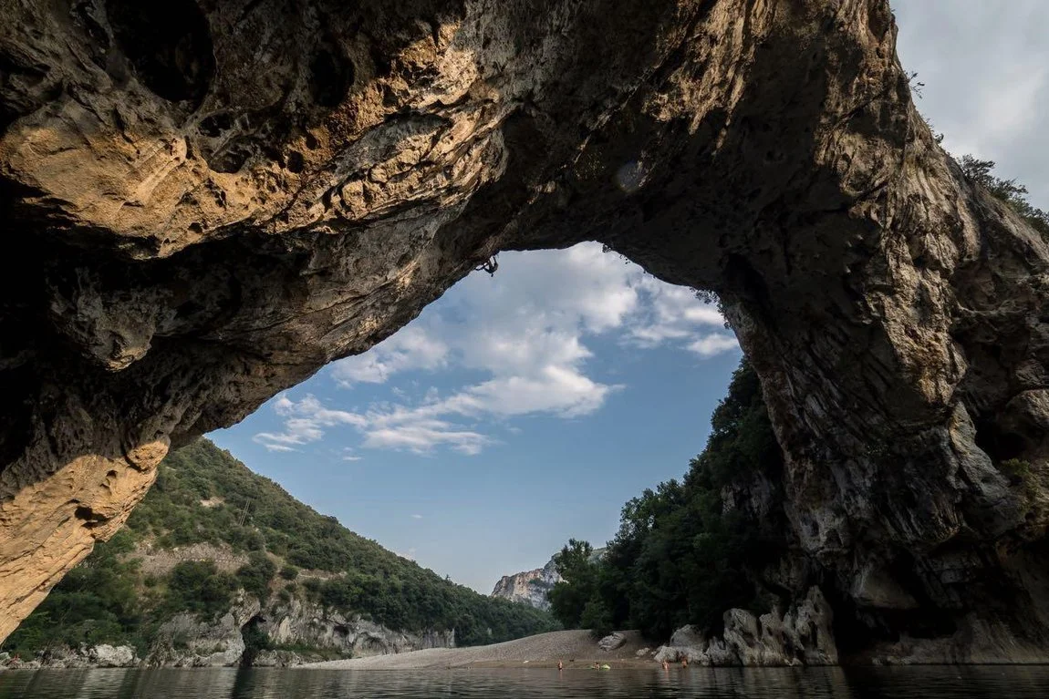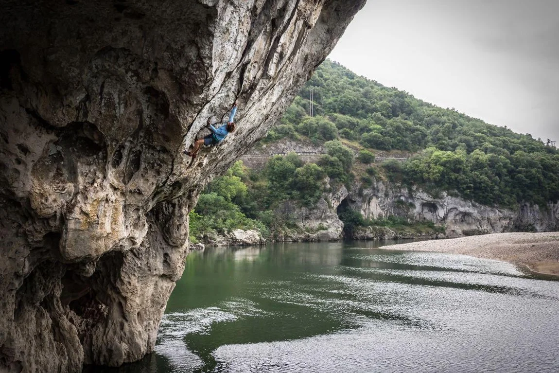 Пон д’Аарк е с впечатляващи размери – 48 м височина и 60 м ширина, а маршрутът, който Крис Шарма преодоля, се оценява с категорията 8c.