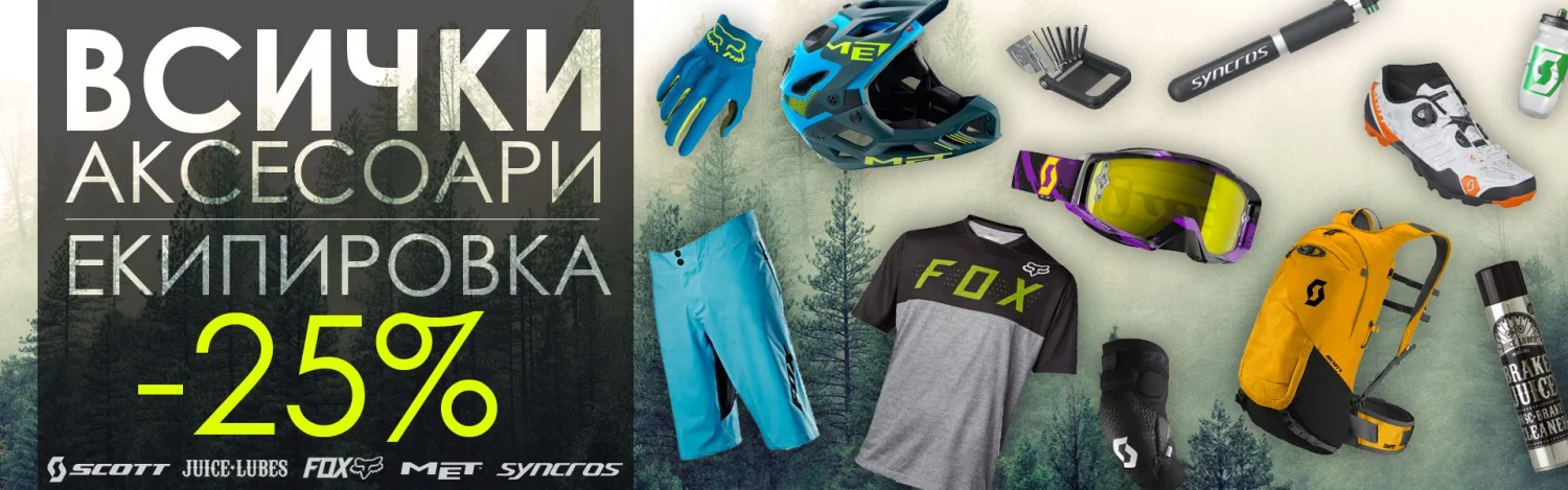 Освен това екипировката и аксесоарите на марките Syncros, Scott, Fox, Met, Bluegrass, Juice Lubes са намалени с 25%.