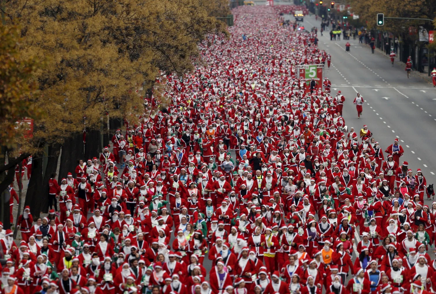 Над 7000 души взеха участие в благотворителната надпревара Дядо Коледа рън, която се проведе по улиците на Мадрид вчера. Всички участници бяха облечени в традиционния костюм на белобрадия старец и пробягаха дистанцията от 5 км в централната част на испанската столица.