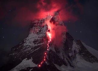 Уникална фотосесия, уловила стотици хора, носещи яркочервени светлини, по билото Хьорнли на връх Матерхорн по случай 150 години от първото му изкачване
