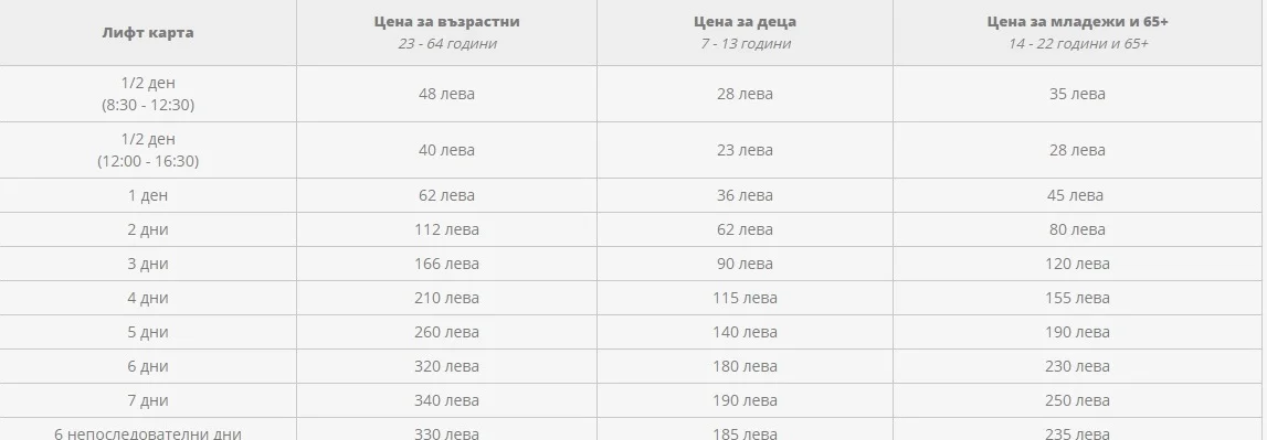 Цените на лифт картите за всички съобръженията ще бъдат следните: