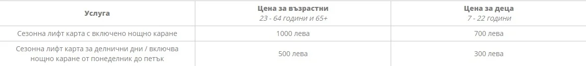 За предстоящия сезон 2020/2021 курорта предлага промоционални цени на лифт картите, които ще може да ползвате и през лятото, както следва: