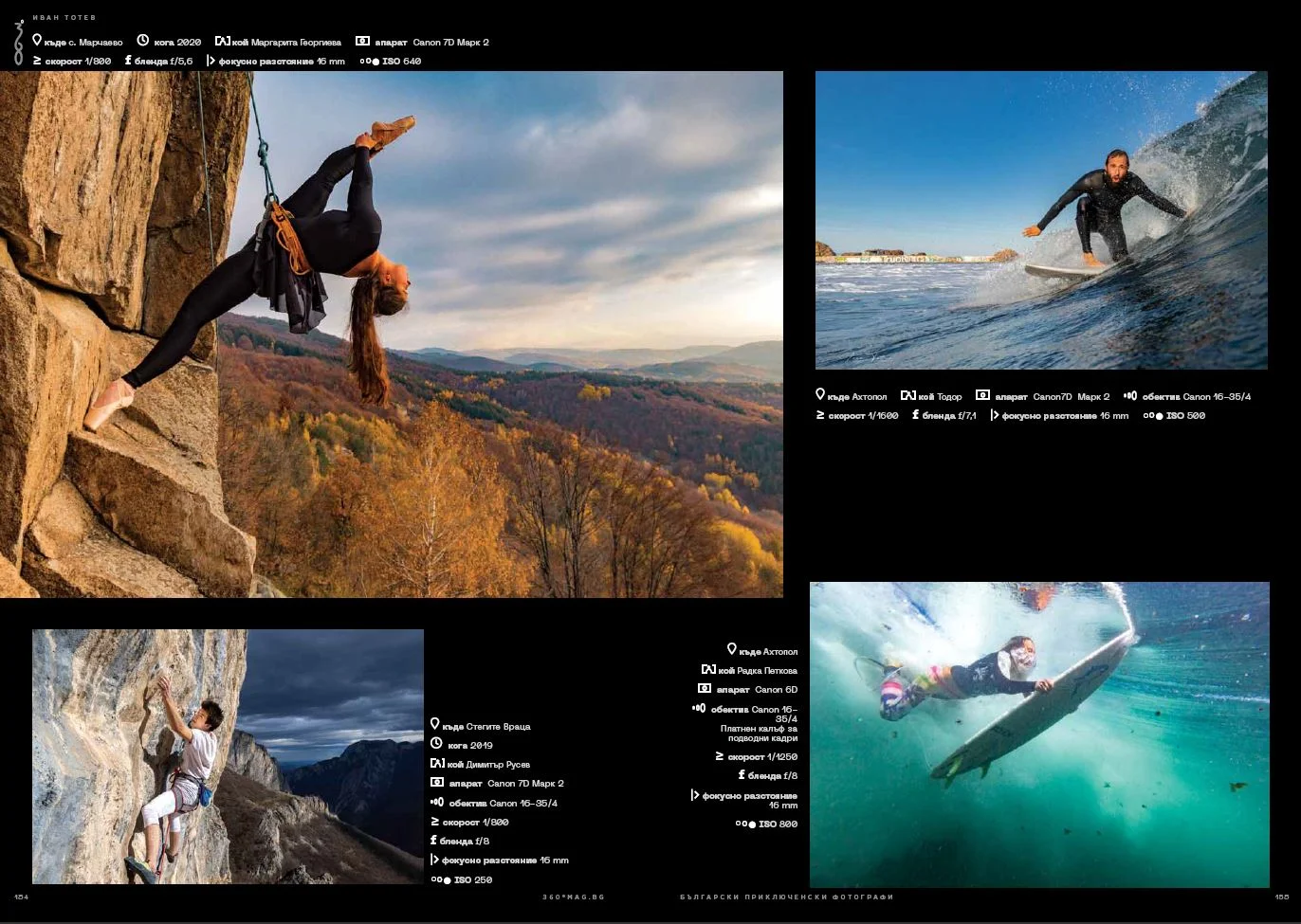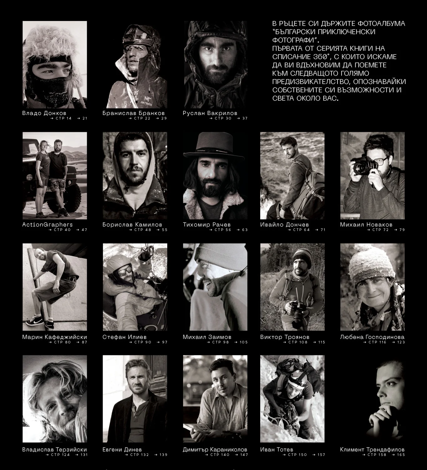 Започваме с фотоалбума „Български приключенски фотографи“*, в който сме селектирали 18 от най-добрите майстори на обектива, доказали се в аутдор средите. В това първо издание се фокусирахме върху онези от тях, които вече 12 години ни помагат да претворяваме нашите мечти във визуално и емоционално пътешествие из страниците на списание 360°. Тъй като поощряваме упоритостта и стремежа към израстване сме отделили няколко страници, за да ви представим и две млади надежди, чиито снимки ще виждате все по-често.