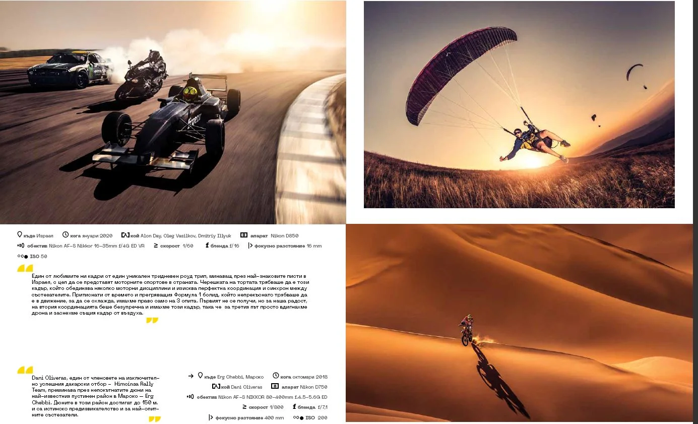 Култ към движението. Скачаме в неизвестното с фотографи, които не се страхуват да са в динамиката на различни аутдор спортове като ски, сноуборд, летене, катерене и всякакви градски предизвикателства – стихията на Тихомир Рачев, Ивайло Дончев, Михаил Новаков, Марин Кафеджийски, Борислав Камилов, Actiongraphers.